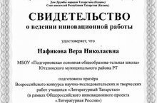 В декабре проходил Всероссийский конкурс научно-исследовательских работ "Литературный Татарстан", по итогам которого учитель русского языка и литературы В.Н. Нафикова получила свидетельство об инновационной деятельности как руководитель, подготовивший призёра этого конкурса.