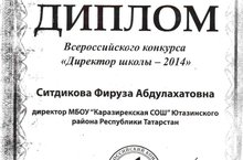Наши руководители школ ежегодно принимают участие в этом престижном конкурсе и становятся победителями. Одна из них Ситдикова Фируза Абдулахатовна – директор МБОУ «Каразерикской СОШ».Она награждена дипломом победителя Всероссийского конкурса «Директор школы-2014». От всей души поздравляем Фирузу Абдулахатовну с этой заслуженной наградой и желаем дальнейших успехов в ее плодотворной деятельности руководителя.