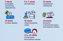 3 июля – география, литература, информатика и ИКТ;6,7 июля – русский язык;10 июля - математика (профиль);13 июля – история, физика;16 июля – обществознание, химия;20 июля – биология, иностранные языки (письменная часть);22, 23 июля – иностранные языки (устная часть). -
