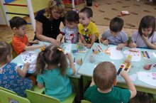 Тәрбияче Мухаметова Р.А балаларның рәсми сәләт ягыннан белемнәрен үстерү өстендә эшли. Дымка бизәкләре белән үрдәкне бизәргә өйрәтә (түгәрәкләр,туры һәм дулкынлы сызыклар,боҗра,нокта һәм борчаклар кулланып). Дымка уенчыкларының матурлыгын,бизәкләрнең төрлелеген,ачык матур төсләрнең килештереп ясалуны күрә белергә өйрәтә.