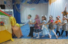 Сегодня детьми старшей группы была инсценирована русская народная сказка "Репка", а в качестве рассказчика был Петрушка - кукольная игрушка. Дети младшей группы были зрителями. Так же выступали дети, которые исполняли музыкальные номера к этой сказке.