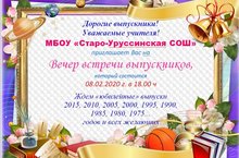 Дорогие выпускники!Уважаемые учителя!МБОУ «Старо-Уруссинская СОШ»приглашает Вас наВечер встречи выпускников,который состоится08.02.2020 г. в 18.00 чЖдем «юбилейные» выпуски2015, 2010, 2005, 2000, 1995, 1990,1985, 1980, 1975…годов и всех желающих