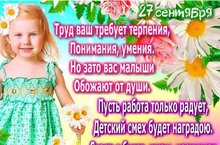 Дорогие наши работники детского сада, с профессиональным праздником вас! Только чуткие, добрые и внимательные женщины могли выбрать эту необыкновенную, но такую ответственную профессию. Ведь воспитание ребенка требует немалого труда, человеколюбия и стойкости характера. Желаем вам крепкой нервной системы, отличного настроения и хорошего самочувствия. Пусть наши малыши дарят вам свои лучезарные улыбки, заряжают неуемной энергией и детством.