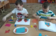 Дети подготовительной группы составляли изображения предмета из отдельных частей; различных геометрических форм изображая сюжет, практиковались вырезание разными приемами, а также техникой приклеивания, пришивания;