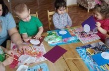 Цель: закреплять знания детей о круглой форме, о различии предметов по величине. Учить составлять изображение из частей, правильно их располагая по величине. Упражнять в аккуратном наклеивании.