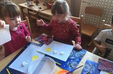 Цель ОД - Вызвать яркий эмоциональный отклик на фольклорный образ солнца. Учить создавать образ солнца в апплекации: приклеивать большой круг, приклеивать лучи, изображать тучку – сминать салфетку в комок и приклеивать, стараясь передать образ