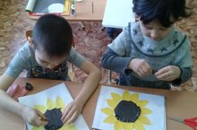 Ручной труд провела Солдатенко Г.М. в подготовительной группе. Делали подсолнух. Клеили лепестки клеем, прикрепляли семечки пластилином, стебель и листок раскрашивали пластилином способом растягивания.