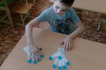 Воспитатель Солдатенко Г.М. с детьми подготовительной группы используют для развития мелкой моторики и речи нетрадиционные пальчиковые игры, сделанные руками родителей, которым тоже небезразлично развитие их детей.