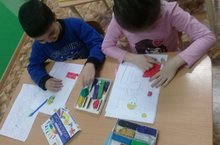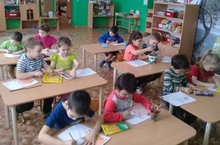 Воспитатель Солдатенко Г.М. с детьми подготовительной группы в свободное время раскрашивают рисунок пластилином, развивая тем самым мелкую моторику, мышление и речь.