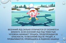 Безопасным для человека считается лед толщиной не менее 10 сантиметров в пресной воде и 15 сантиметров в соленой. В устьях рек и притоках прочность льда ослаблена. Лед непрочен в местах быстрого течения, бьющих ключей и стоковых вод, а так же в районах произрастания водной растительности, вблизи деревьев, кустов и камыша. Если температура воздуха выше 0 градусов держится более трех дней, то прочность льда снижается на 25%. Прочность льда можно определить визуально: лед голубого цвета – прочный, белого – прочность его в 2 раза меньше, серый, матово – белый или с желтоватым оттенком лед ненадежен.