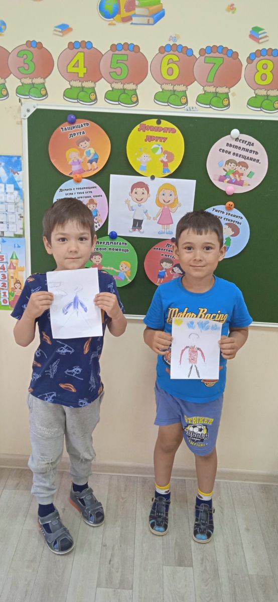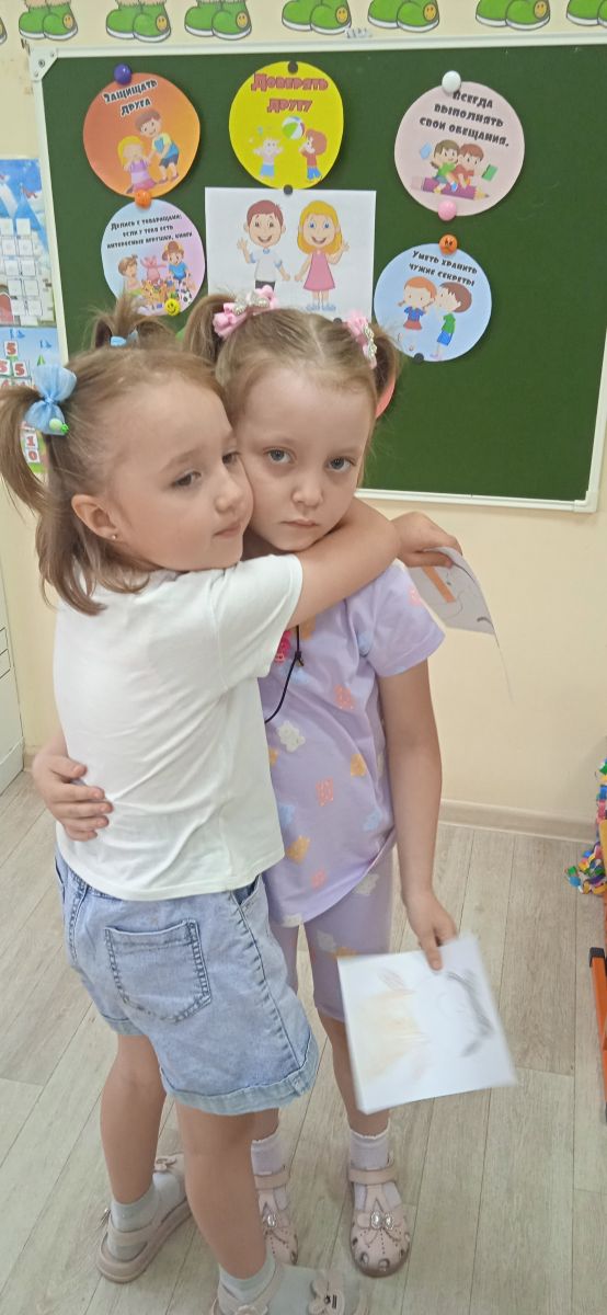 В " День дружбы "воспитанники старшей группы " Лимпопо "через игры: " Хорошо- плохо ", " Друг к другу ", " Помоги другу "уточнили представление о том, что значит " уметь дружить " Рассмотрели картинки " Правила дружбы ", " В нашей группе всё это можно ". В конце беседы " Дружбой дорожить умейте " дети с большим желанием и интересом нарисовали и подарили "портрет друга".