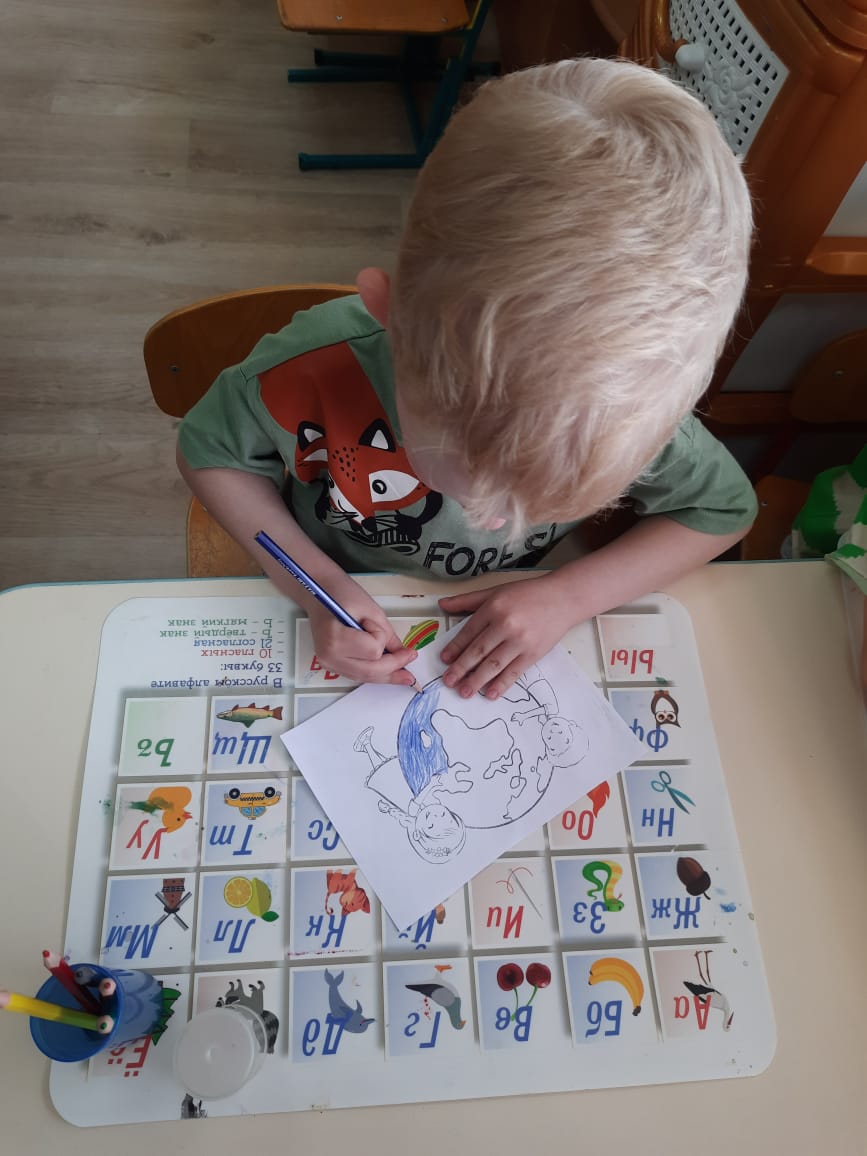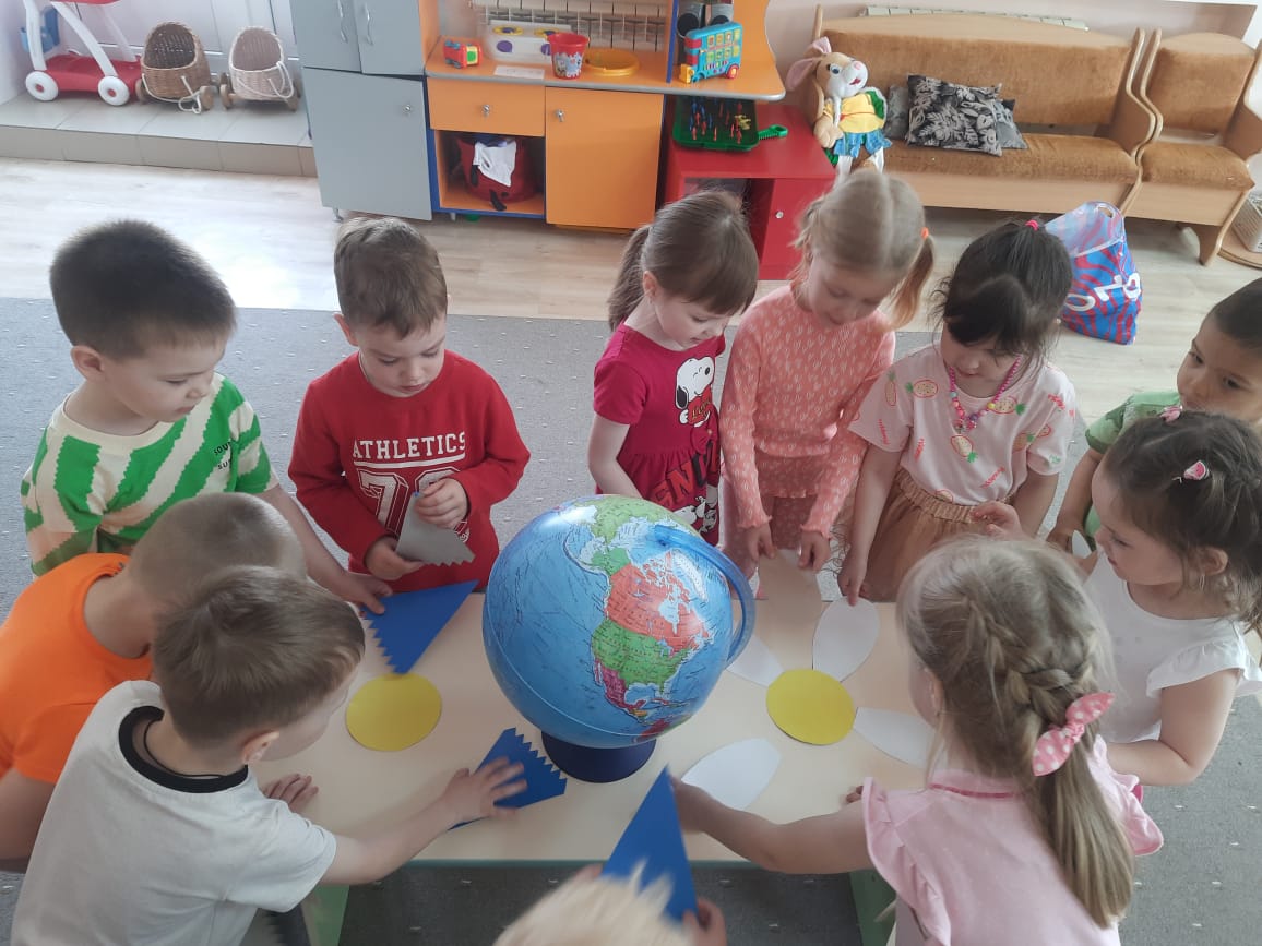 рассмотрели макет планеты Земля - Глобус, глядя на него закрепили знания, что Земля имеет форму шара, что цветом изображены: голубым - вода; желтым, белым, коричневым - суша.