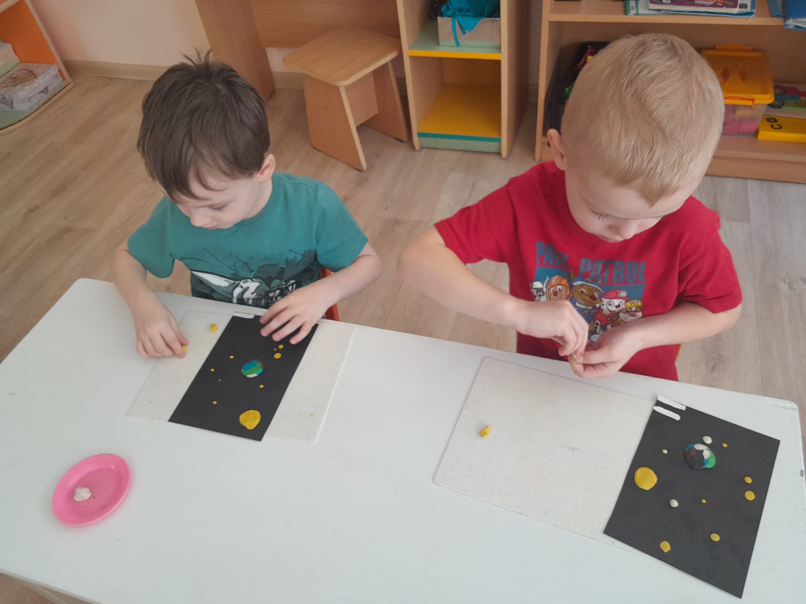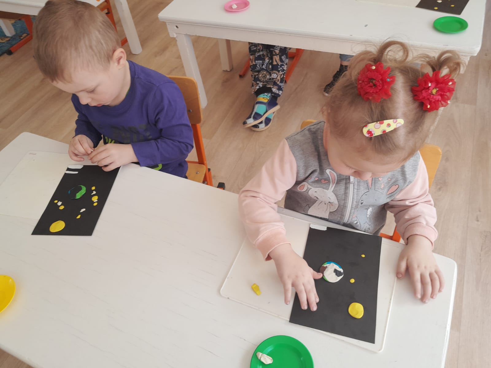Лепка "Космос". Воспитанники учились передавать образ звездного неба посредством пластилинографии. Закрепили навык раскатывания комочков, сплющивания, делить форму на мелкие части. Учились доводить начатое дело до конца.