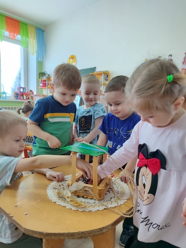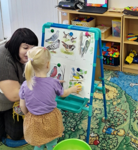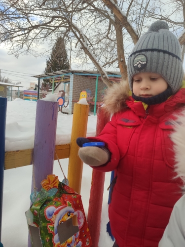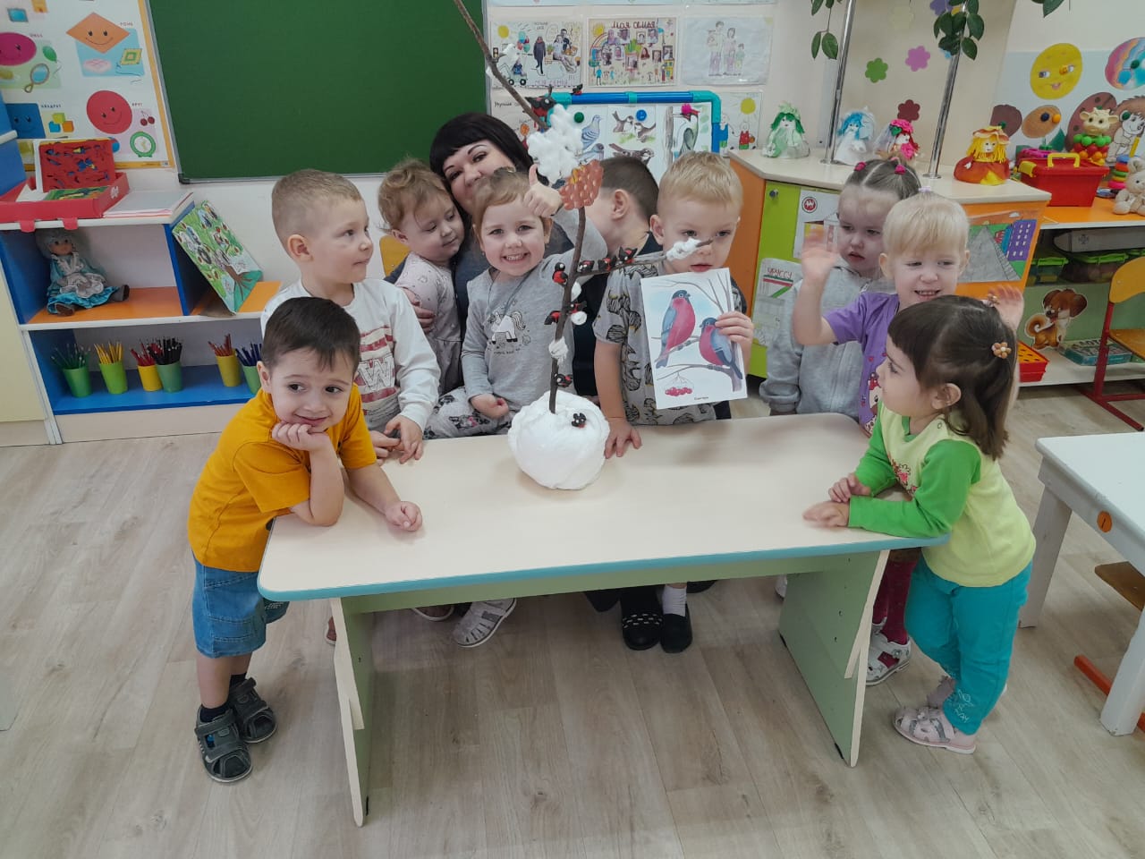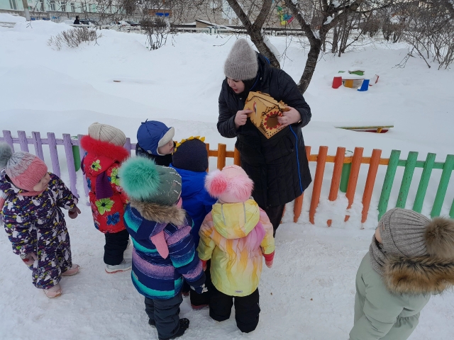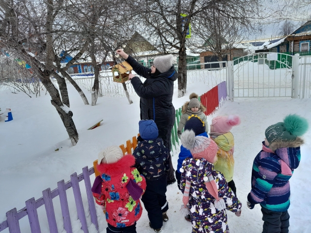 Воспитанники второй младшей группы " Радость" (педагог Маркелова Т.Н.) продолжали беседовать на тему : " Зимующие птицы" - закрепили название птиц по внешнему виду, отвечали на вопросы с опорой на картинки. Играли в игру "Волшебный мешочек", по цвету шарика называли птицу ( синица, снегирь). На прогулке повесили кормушку для птиц, с целью воспитание любви к природе и бережное отношение к птицам.