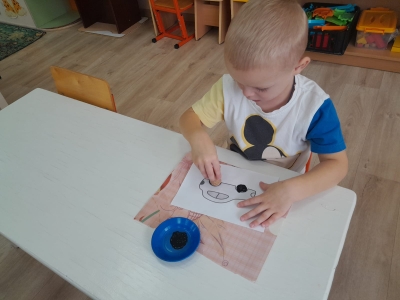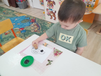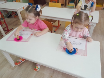 Воспитанники младшей группы (воспитатель Маркелова Т.Н.) на занятии по рисованию с помощью нанесения оттиска на бумаге, используя штамп дорисовывали недостающие детали к автомобилю - колеса.
