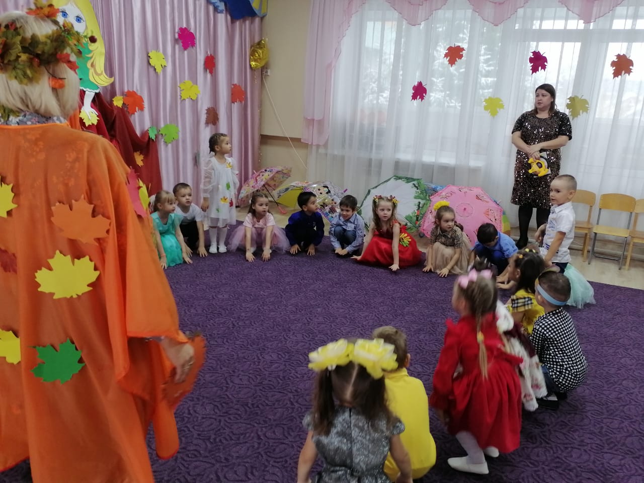 В старшей группе (воспитатель Фахуртдинова Е.Г), прошло праздничное мероприятие, посвященное времени года Осень. Для ребят это запоминающийся, радостный и яркий праздник, который помогает им закрепить представления об осени как времени года. И хоть осень и называют «унылой порой», тем не менее, кто как не дети больше всего радуются ярким разноцветным листьям, опавшим с деревьев. Ребята с нетерпением ждали осенний праздник, и не зря, ведь он прошел очень весело и интересно. К детям в гости пришла Королева Осень. Вместе с ней ребята водили хороводы, пели песенки об осени, играли в веселые игры, читали стихи. Особенно ребятам понравились игры, в которых они проявили ловкость и смекалку. На протяжении всего праздника присутствовал положительный эмоциональный настрой, все ребята получили массу приятных впечатлений. Детские осенние праздники – это море улыбок и веселья, удивительные чудеса, волшебные краски и звонкий смех детей. Праздник удался на славу!