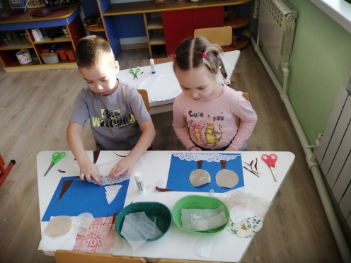 Аппликация в нетрадиционной технике "Зимняя сказка" из лоскутков тюля и ажурных салфеток. Цель: познакомить детей с новой нетрадиционной техникой аппликации. Формировать умение работать с тканью, вырезать из неё предметы, наклеивать на фон. Воспитывать эстетическое чувства, любовь к красоте зимней природы.