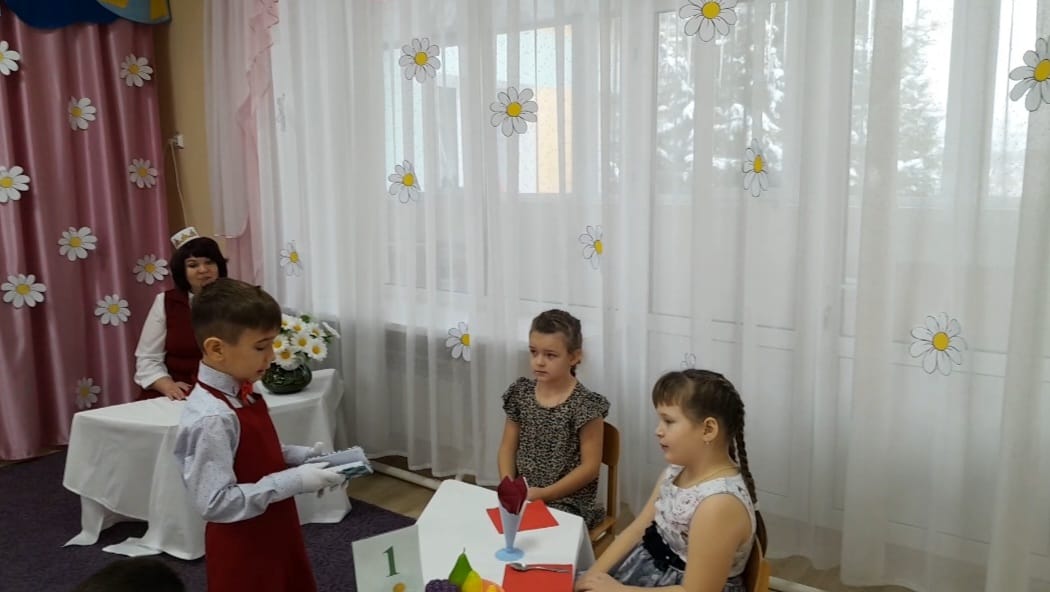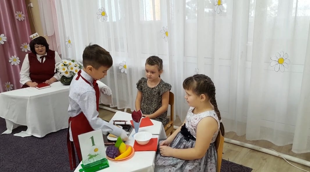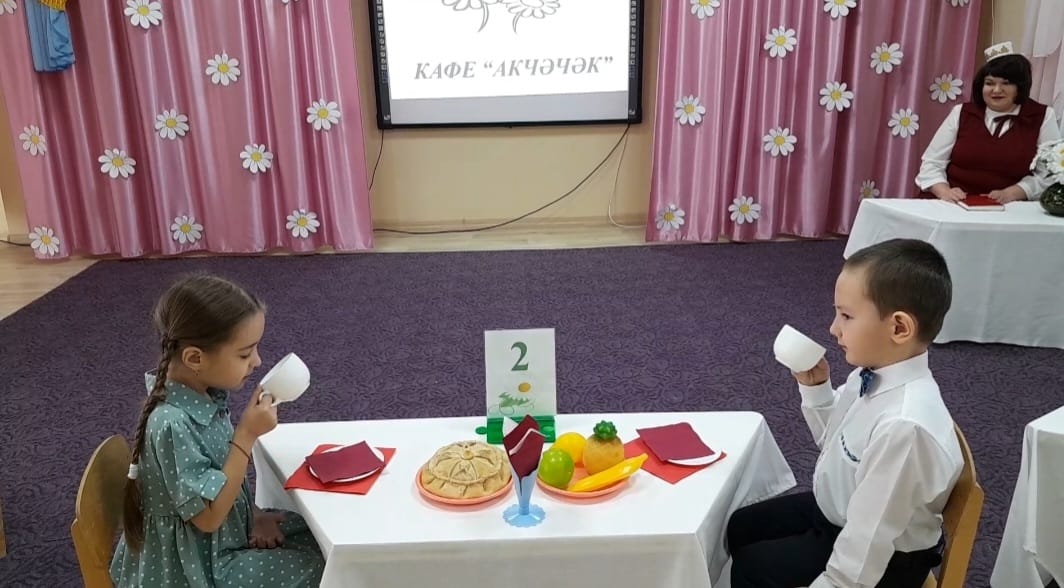 Игра "Кафе". Цель: Обогащение словарного запаса детей. Совершенствование культуры речи, вызывать интерес к собственной речи. Повторить и закрепить название продуктов питания. Развивать умение отвечать на вопросы: «Кая барасың?» « Нәрсә кирек?» «Син нишлисең?». Продолжать развивать связную диалогическую речь. Воспитывать доброжелательные отношения между детьми и умение вести диалог на татарском языке. Воспитывать интерес к изучению татарского языка.