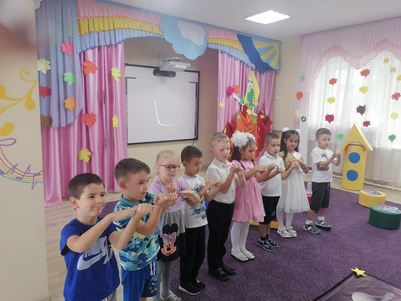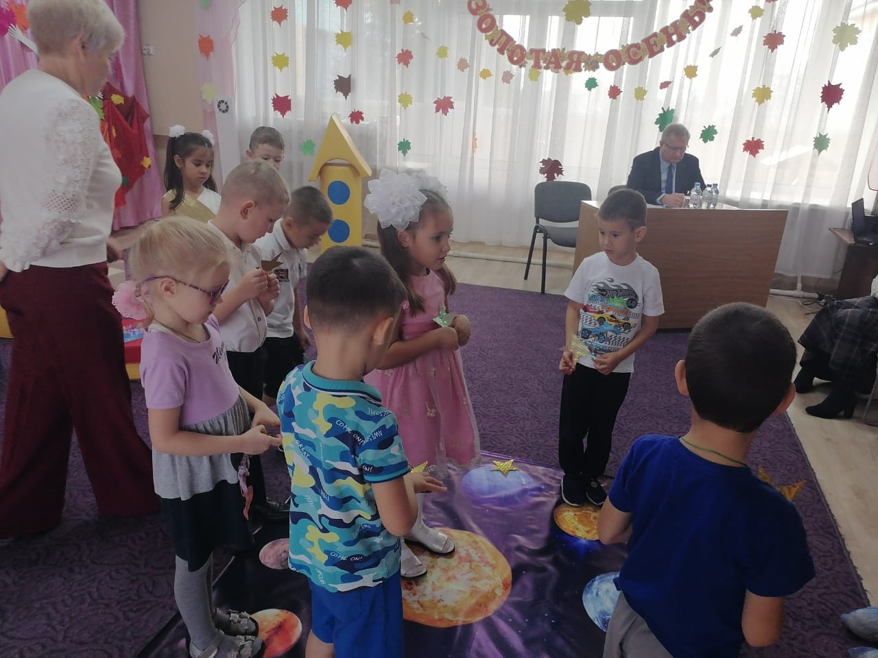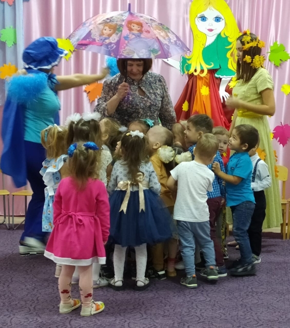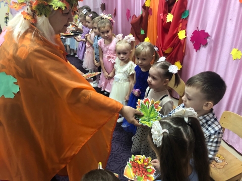 Сегодня в средней группе прошло мероприятие посвященное празднику осени. дети вместе с королевой Осенью, а также сказочными персонажами Гномиком и Тучкой играли в игры, собирали урожай, исполняли песни и танцы. Мероприятие было веселым, ярким и красочным.