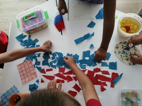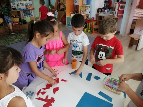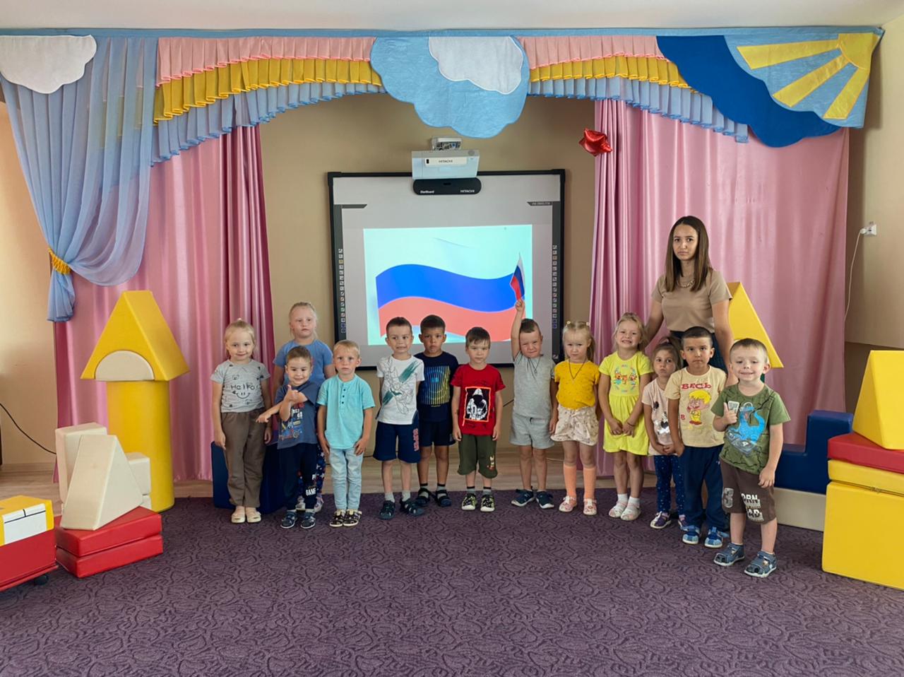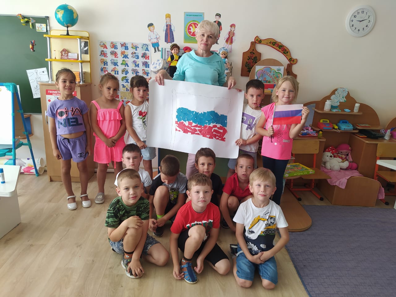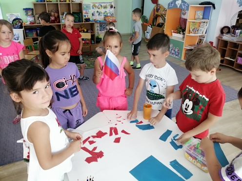 Коллективная аппликация "Флаг России". Цель. Формировать представления о российском флаге. Закрепить цвета триколора, их символичное значение. Воспитывать чувство патриотизма, дружелюбие.