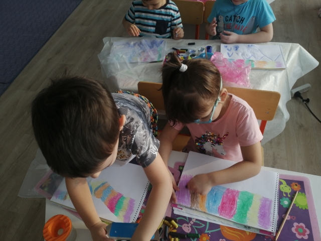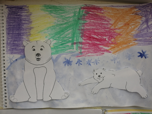 Рисование с применением нетрадиционных техник "Белый медведь и северное сияние". Цель: помочь детям освоить новый приём рисования-полиэтиленовой плёнкой. Упражнять в рисовании цветными восковыми мелками, гуашью. Закреплять и расширять знания о животных Севера, о прекрасном явлении природы-Северном Сиянии. Воспитывать любознательность, аккуратность.