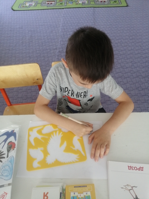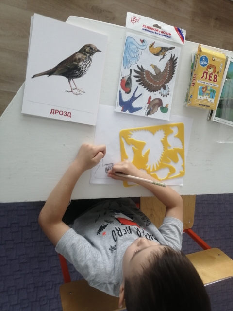 Работа с трафаретом, просмотр картинного материала по теме "Перелетные птицы". Цель: закрепить и расширить представления о перелетных птицах, развивать точность рук, мелкую моторику, речь детей.