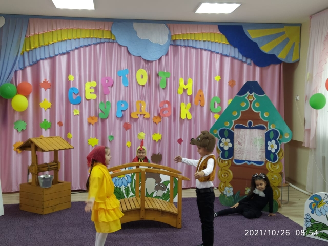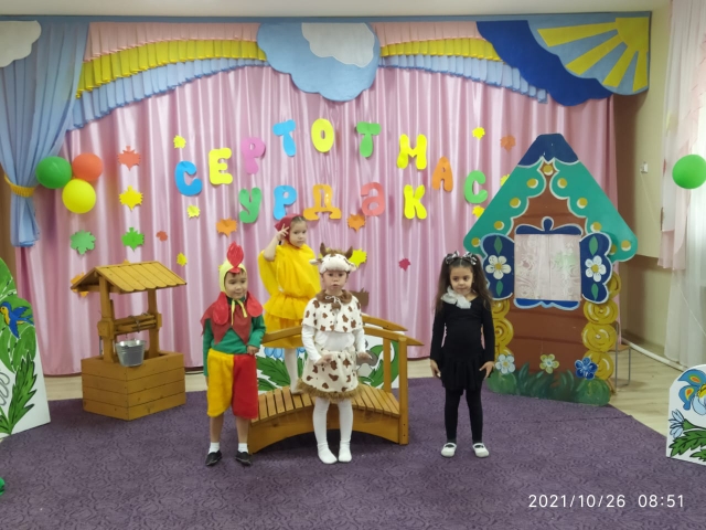 Цель: Развивать интонационную выразительность речи, добиваться правильного произношения. Совершенствовать активный словарь детей. Воспитывать творческую самостоятельность, артистические качества, любовь к театру. Учить чувствовать и понимать эмоциональное состояние героев (животных), уметь изображать их с помощью движений, мимики, жестов. Закреплять интерес к театрально-игровой деятельности. Воспитывать любовь к своим близким, к татарскому фольклору.