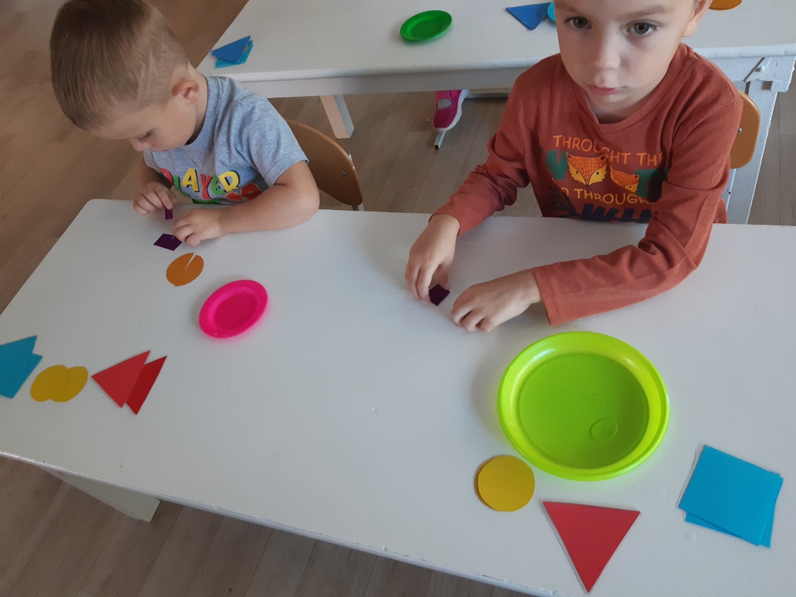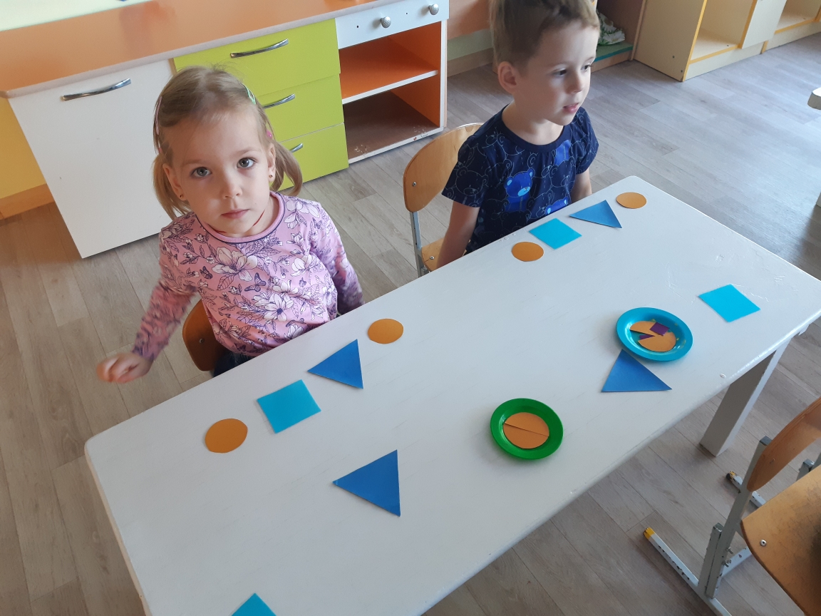 Программное содержание: Продолжать учить сравнивать две группы предметов разных по форме, определяя равенство или неравенство на основе сопоставления пар. Закреплять умение различать и называть плоские геометрические фигуры: круг, квадрат, треугольник.