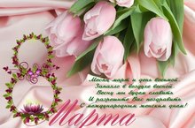 С международным женским днем! Пусть весна цветет не только на улице, но и в душе, а красота радует всех окружающих. Счастья тебе, благополучия и гармонии. Желаю, чтобы все твои дни были солнечными, яркими и запоминающимися, чтобы в твоём доме всегда было уютно и тепло.