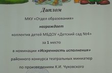 Наша награда 1 место на районном конкурсе театральных миниатюр по произведению К.И. Чуковского 24.05.2019