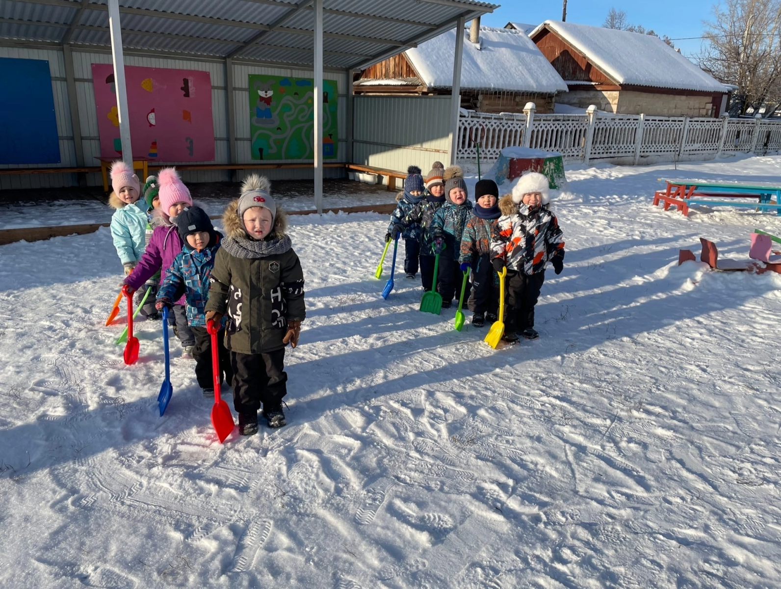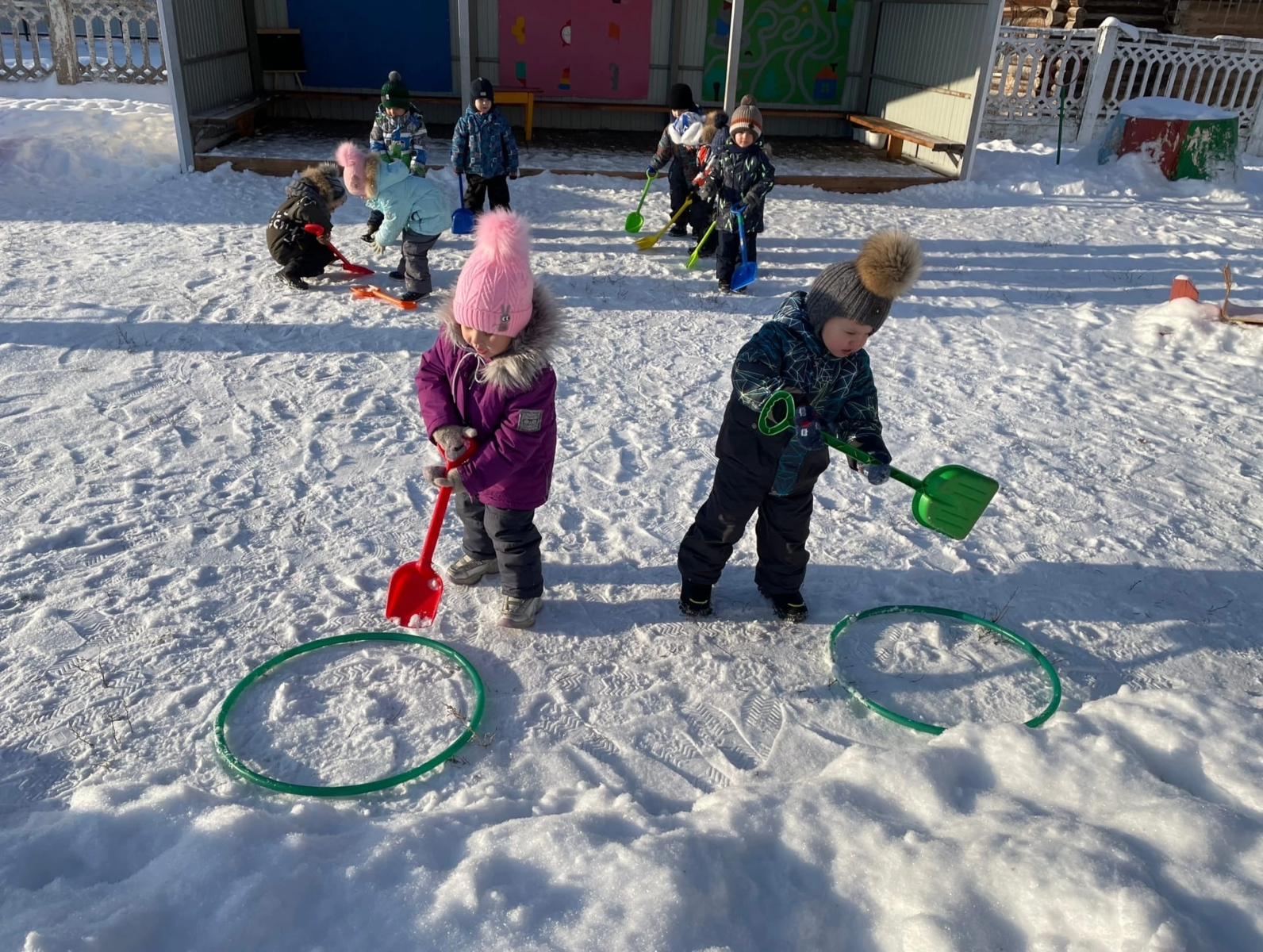 Зимой прогулки с младшими дошкольниками разрешается проводить при температуре воздуха не ниже —15°, со старшими — не ниже —22°. При этих же значениях температур, но сильном ветре рекомендуется сокращать продолжительность прогулки, если нет возможности защитить детей от ветра специально устроенным навесом.