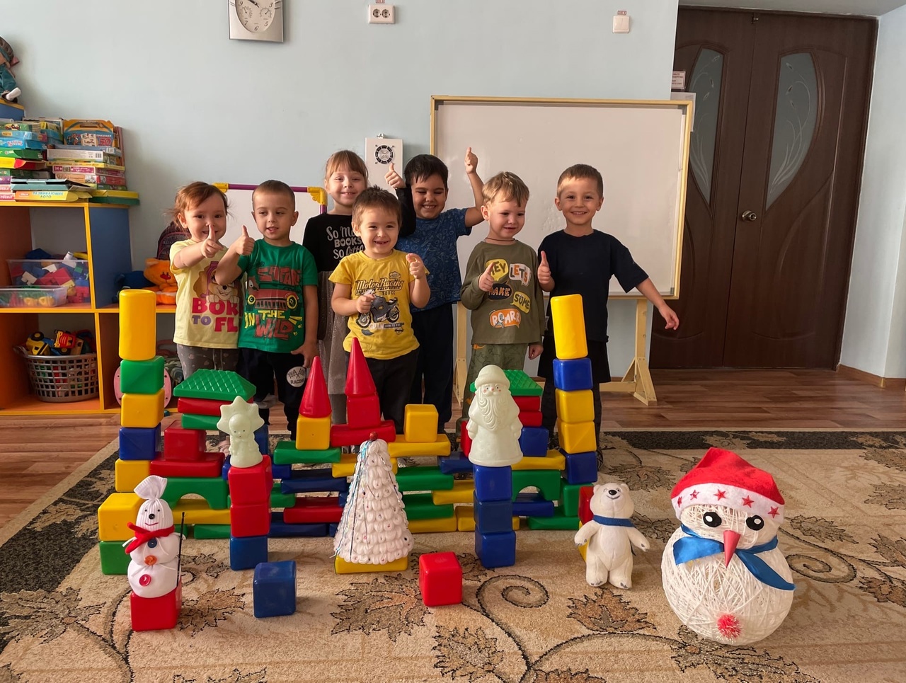 Игры со строительным материалом: постройка дома для Снегурочки и Деда Мороза. / Төзелеш материаллары белән уеннар: Кар кызы һәм Кыш бабай өчен йорт төзү.