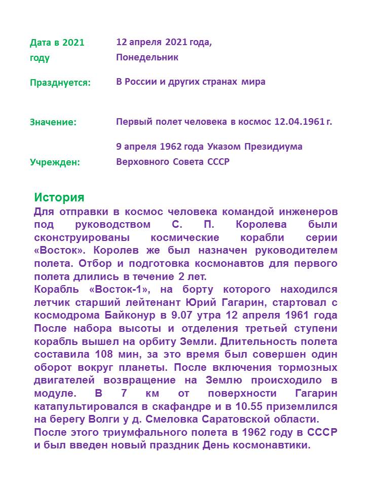 День Космонавтики 12.04.2021