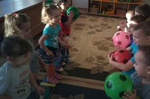Наши малыши учаться ловить и бросать мяч друг другу.
