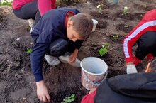 Сегодня ребята с трудового лагеря пропололи цветник, полили цветы, облагородили вокруг ёлок, убрали камни и мусор, разобрали ванночку для воды и выбросили осколки от камней.