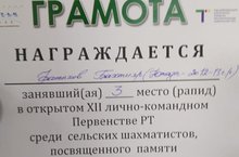 Диплом 3 место в первенстве РТ по шахматам 16.04.2022