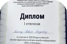 Диплом 1 степени Республиканского этапа VIII Всероссийской научно-практической конференции "Шаг в будущее" 16.04.2022