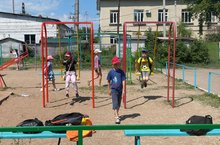 Так же, несмотря на жаркий день, сходили на новую детскую площадку по улице Ленина, где играли в Догонялки, катались на качелях. -