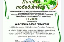 Поздравляем Халиуллину Олесю с победой во 2 Всероссийском конкурсе исследовательских работ "Как прекрасен этот мир"
