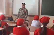 В рамках месячника военно-патриотического воспитания, а также в предверии празднования Дня защитника Отечества с юнармейским отрядом "Патриот" был проведен классный час. Ребята много знают о защитниках нашей Родины, о военных профессиях, о произведениях, об армии нашей Родины. А сегодня мы познакомились с очень интересным человеком -это ветеран боевых действий Гильмутдинов Марат Нурфаязович. Ребята с интересом и вниманием слушали реальные факты о боевых действиях, смотрели слайды, задавали вопросы. За проявленную отвагу и мужество он получил звание ветерана боевых действий.