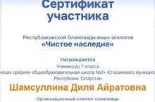 Шамсуллина Диля приняла участие в Республикаснкой олимпиаде "Чистое наследие". «Чистое наследие» — нескучная олимпиада по экологии для школьников с 5 по 9 классы. В олимпиаде могут принимать участие обучающиеся из всех регионов России, а также из Казахстана, Узбекистана и Азербайджана.В течение двух месяцев Диля выполняла изадания: марафон добрых дел,