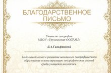 В рамках «Векслинских чтений» учитель географии МБОУ «Уруссинская ООШ№2» Гильфанова Л.А. была награждена Благодарственным письмом от Русского географического общества «За большой вклад в развитие школьного географического образования и популяризацию географических знаний среди учащейся молодежи».