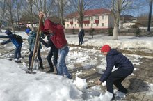 Весна — это не только ручьи и подснежники, но также грязь и накопившийся за зиму мусор. Приходится засучить рукава и приняться за уборку. Учащиеся школы раскидали снег возле Монумента "Вечный огонь"