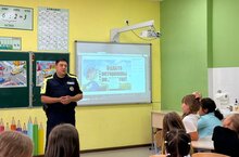 После утренней зарядки и вкусного завтрака к нам в гости пришли руководитель отряда ЮИД Камалова Регина Фирдаусовна и инспектор ГИБДД Жанназаров Рустам Маликович.