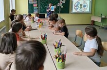 с выставкой, посвященной дню начала Великой Отечественной войны, показала документы личного происхождения участников Великой Отечественной войны 1941-1945 годов, хранящиеся у них в архиве, рассказала о подвигах ветеранов. Немного рассказала и об истории нашего посёлка, показав ребятам фотографии как выглядели некоторые социальные объекты посёлка ранее, и как сейчас. Также ребятам показали архивохранилище, который оборудован мобильными стеллажами.