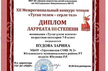 Учащаяся 7а класса Пудова Зарина стала лауреатом III степени в XII Межрегиональном конкурсе чтецов "Туган телем-серле тел".