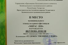 Күптән түгел мәктәбебезнең 5нче сыйныф укучысы Якупова Язилә (укытучы Бачкова Э.В.) ТАССРның 100 еллыгы уңаеннан оештырылган “Әбием сандыгы” исемле бәйгесендә катнашты. Бәйге туган телебезне, халкыбызның гореф – гадәтләрен, мәдәниятен өйрәнү һәм саклау максатыннан үткәрелде. Язилә “Әбиемнең күңел сандыгы” дип исемләнгән номинациядә үзенең иҗади эше белән катнашып, II урынга лаек булды. Аны шушы җиңүе белән чын күңелдән котлыйбыз. Алдагы иҗади эшләрендә дә уңышлар теләп калабыз.