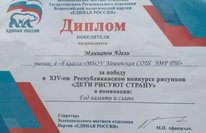 Поздравляем Маннапова Аделя ученика 4б класса "МБОУ Айшинская СОШ ЗМР РТ" за победу в ХIV Республиканском конкурсе рисунков "Дети рисуют страну" в номинации "Год памяти и славы". Организатор конкурса ЗМО ТРО ВПП "Единая Россия".