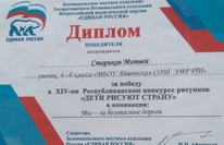 Поздравляем Старикова Матвея ученика 4б класса "МБОУ Айшинская СОШ ЗМР РТ" за победу в ХIV Республиканском конкурсе рисунков "Дети рисуют страну" в номинации "Мы - за безопасные дороги". Организатор конкурса ЗМО ТРО ВПП "Единая Россия".