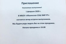 ОБЪЯВЛЕНИЕ! ВЕЧЕР ВСТРЕЧИ ВЫПУСКНИКОВ В МБОУ "Айшинская СОШ ЗМР РТ" СОСТОИТСЯ 01.02.2020 В 16.00